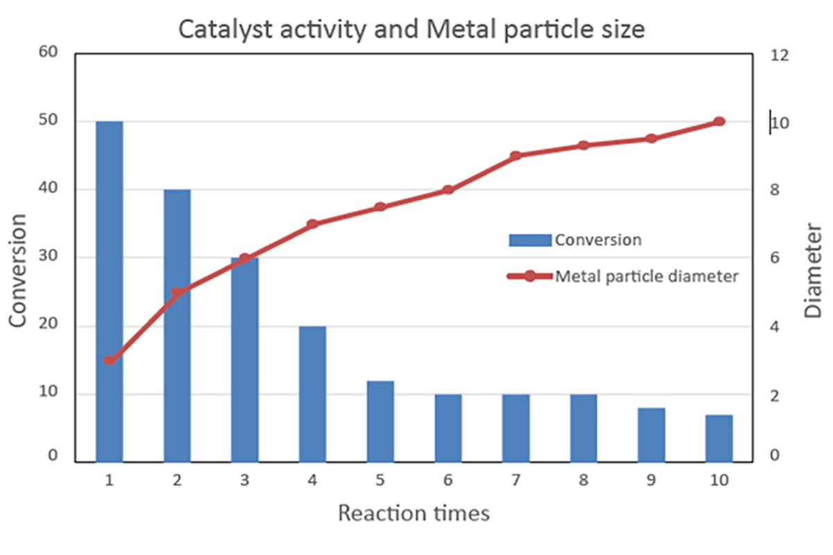The metal dispersion rate is a critical parameter in heterogeneous catalysis. It refers to the proportion of metal atoms that are exposed on the surface of a catalyst relative to the total number of metal atoms present (often expressed as a percentage). Metal dispersion can be calculated through pulse chemisorption using gases such as CO or H2, which selectively chemisorb onto the metal surface. This is achieved by continuously pulsing a specified amount of gas into the sample until saturation is reached. Pulse measurement determines the chemisorbed quantity by taking the saturated peaks as a reference. The difference in peak areas between unsaturated and saturated state is giving the adsorbed amount. The metal dispersion rate is essential for assessing, optimizing, and understanding the performance and longevity of metal-based catalysts.